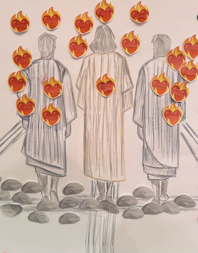 Nakon te duboke izmjene misli i osjećaja, svaka je sudionica na izrezane papirnate „kamenčiće“ ispisala prepreke koje ju spotiču na putu rasta u vjeri i priječe da uistinu doživi Krista. Nasuprot tome, na izrezanim plamtećim srcima djevojke su opisivale svoj žar – sve ono lijepo što osjećaju dok razgovaraju s Kristom – osjećaje dubokog mira, ljubavi, sigurnosti i unutarnje slobode. Na kraju, sve su djevojke, jedna za drugom, te simbole s osobnim zapisima lijepile na zajednički plakat, dajući tako i vidljiv pečat proživljenim doživljajima.